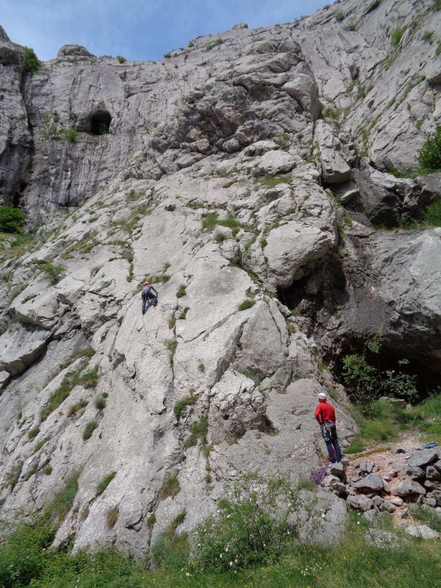 El segundo largo podemos considerarlo como el largo más bonito de la vía y unos de los largos en bavaresa más bonitos que podemos escalar por toda la escuela de las Hoces de Vegacervera. Salimos en vertical para en muy pocos metros coger la fisura que continuaremos escalando hasta el final de la bavaresa, para después por terreno de placa, volver a coger otra fisura vertical y con esta última fisura alcanzar la segunda reunión, viven visible, situada en el muro frontal. Este largo está prácticamente equipado con «chapas», aunque podemos asegurarlo con seguros flotantes sin necesidad de utilizar los seguros fijos. Hasta esta segunda reunión, escalaremos unos 50ml. de un grado máximo de V+/6a. En este largo podremos utilizar seguros flotantes en su tramos final, las tallas más utilizadas serán medias y pequeñas, tales como Totem amarillo, morado, verde y similares.